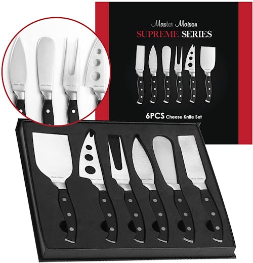 If you take your charcuterie seriously, get the right tools for the job. This six-piece cheese knife set has every cheese knife you’ve heard of and a few you haven’t. The chisel knife is great for cutting slivers of parmesan and other hard cheeses. The fork stabs hard-to-pick-up feta and pickles. The spreader is great for goat and cream cheese. The narrow plane lets you shovel up small pieces. And the pronged knife is just useful and has holes that stop cheese from clinging to the blade.