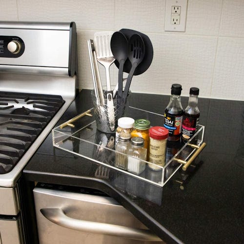 A serving tray is such a useful item. You can use it to carry drinks or food, sure. But it also makes a great storage tool. Gather all the clutter on the bathroom or kitchen counters into this clear acrylic tray and it all looks less like clutter, more like a display, and is suddenly easy to move out of the way for cleaning. It comes in seven sizes, each with gold or silver handles.