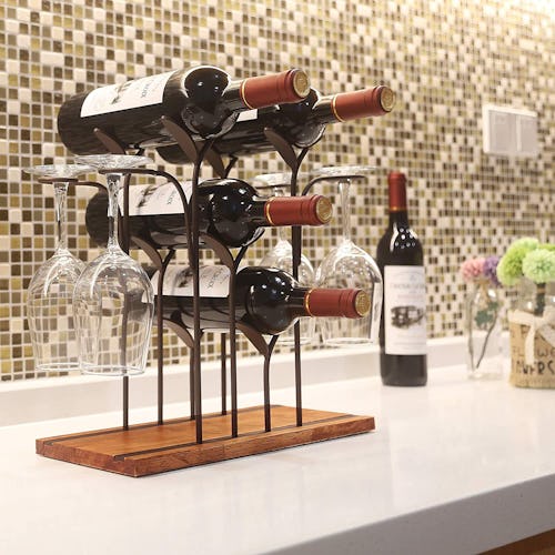 Set a few bottles of wine and stemmed glasses into this artistic tabletop wine holder and create a tempting and decorative shelf for an evening of drinking vino. (Or to store a few bottles for the future if that’s more your speed.) The wooden base and iron branches are nice to look at on their own, but really look great filled with wine. It holds four bottles and four glasses.