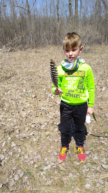 We saw two snakes on our walk and Clayton found a beautiful big feather, I think from a turkey. He came up with a brilliant idea.