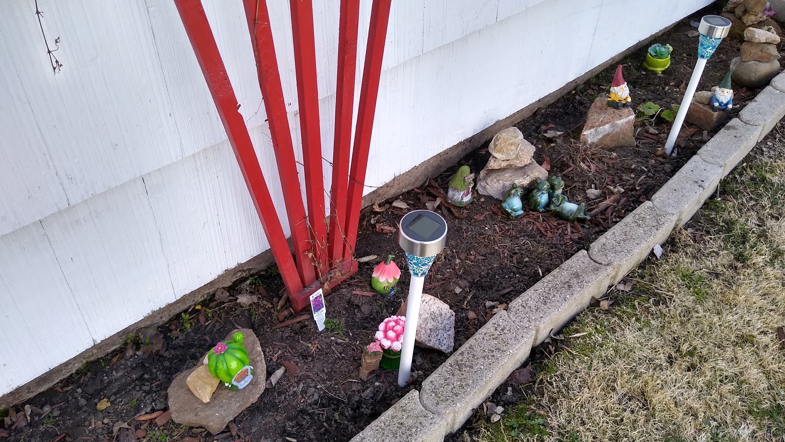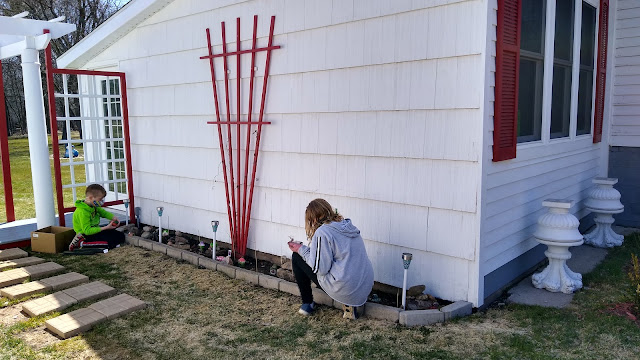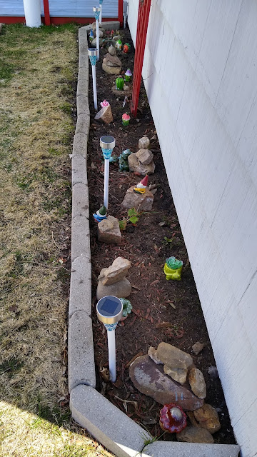 Back in January, before all this virus stuff hit, the kids had been shopping with me in the Dollar tree store. They picked out an assortment of little fairy houses, garden gnomes, and froggies and turtles to set out in a beautiful little array in the flower bed.