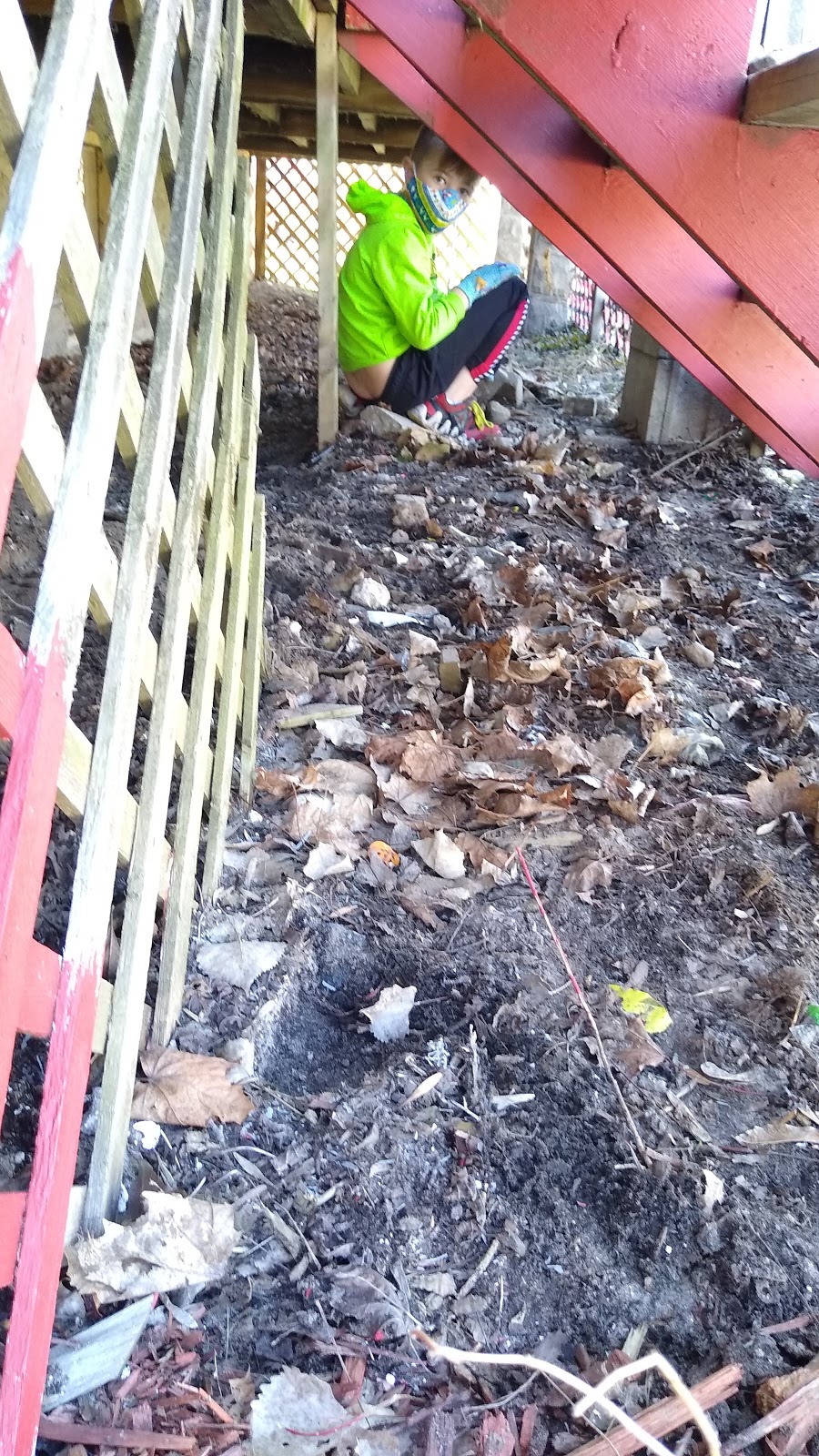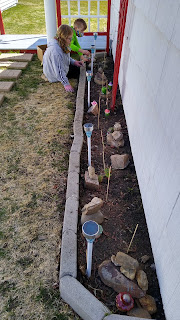 When snack time was over, they went to work on the flower garden. I marked where there would be perennial plants coming up with little sticks. They arranged clusters of the newly unearthed rocks into beautiful art in the flower garden.