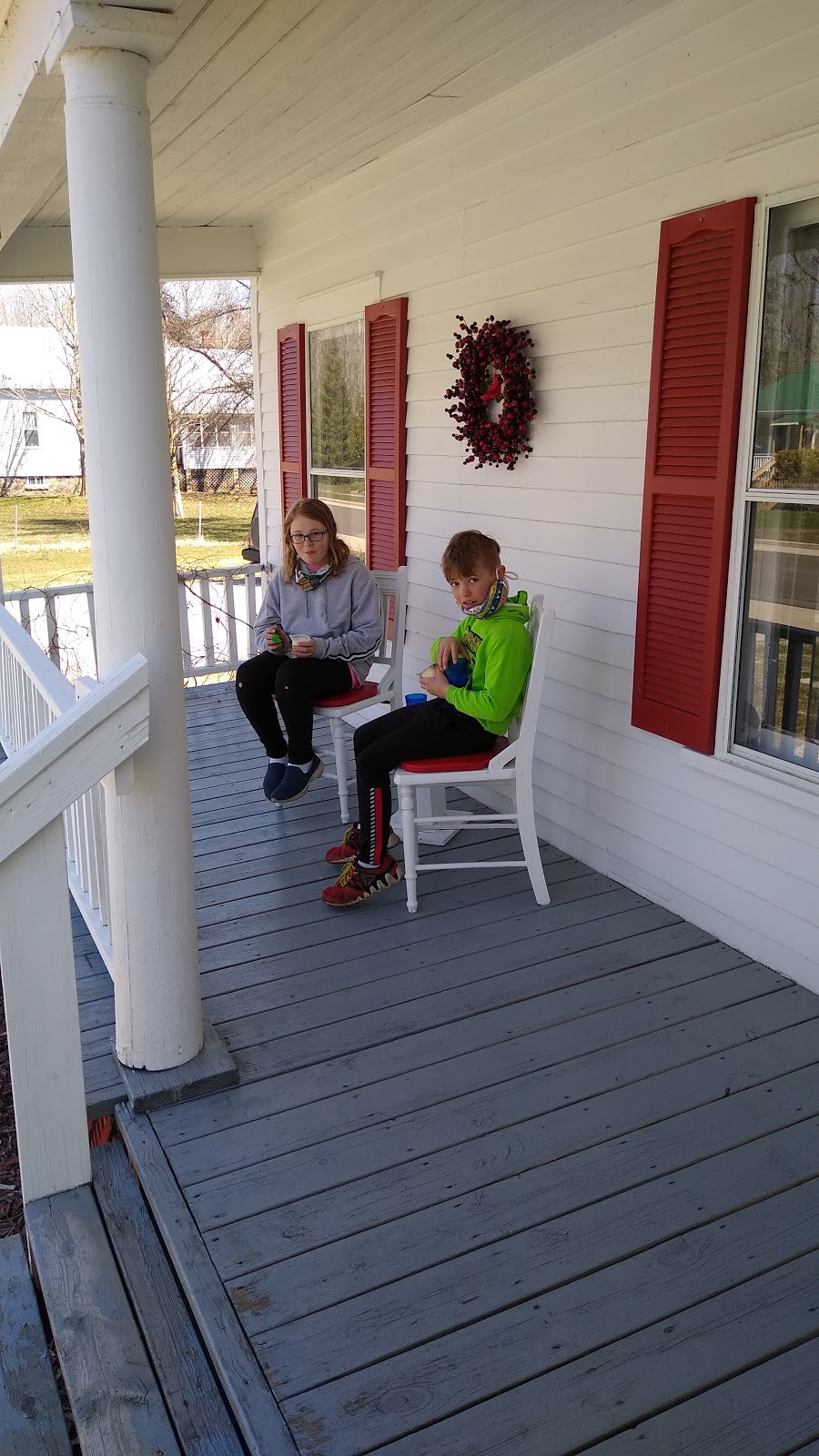 I brought lunch out to the front porch, I put the kids' food down to there end, and our food over to our side by the rocking chairs. So we socially distanced our little lunch together and had a nice time visiting back and forth.
