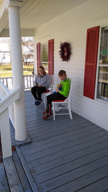 They took a break for a little snack on the front porch. I left the snack out there in advance, set by their two chairs. Then we went and sat on the other end of the porch in our rockers while they enjoyed their snacks.