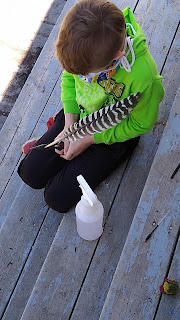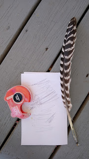 When we got back to the house, while I was making a lunch inside, Clayton was determined to turn his turkey feather into a quill pen!