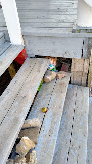 The first job was for Clayton, the badger, to crawl underneath our front porch through the little triangular access hole on the side of the stairs. While under there he removed all of the loose bricks, stones, and pieces of broken cement that have accumulated over the years underneath the porch behind the lattice.