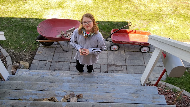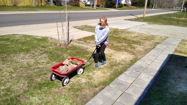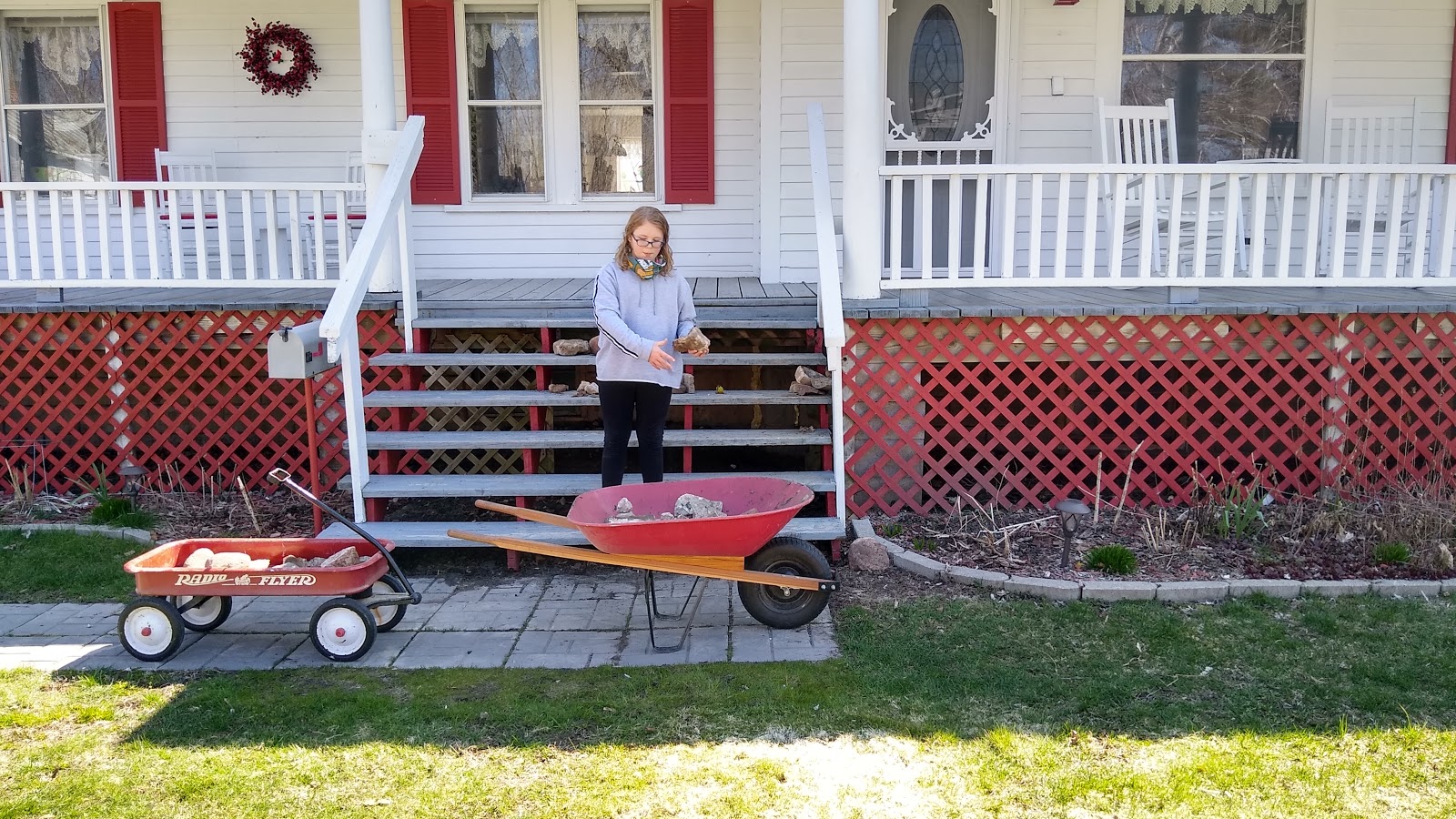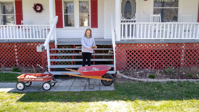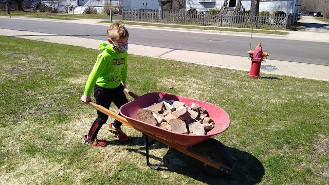 Once they were done, it was time to wheel away the product of their work. Chelsea's wagon went to the side of the she shed to become rocks for the flower garden.