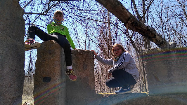 We walked around with the kids and came up on the old barn foundation from a farm a long time ago. The barn had burnt down but the cement walls are left behind with all of the little square shapes where the windows had been at one time.