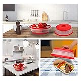 WENWELL - Saving so much plastic wrap bpafree plastic and silicone for a heatresistantfoodsafe platewont melt in the microwave or dishwasherIf you dont like your food splattering in your microwavethis product is for you Easy to storage expands to 36 inches and collapses to 1inch its tall enough to cover most plates of foodand shallow bowlsit folds pretty flatso it can be easily stored or hung somewhere other than in your microwave Nice vent holes on the top the vents allow moisture to exit during heatingso one can avoid food explosions and messy cleanupsthey trap quite a lot of steamwhich allows us to use it as a cooking lid on our dishesof course it is also a multifunctional fruit and vegetable drain basket